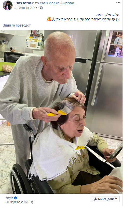 На неа е прикажан 92-годишен маж како го фарба коренот на косата на неговата сопруга, а привремениот фризерски салон е сместен во нивната кујна.