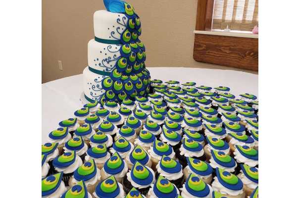 Како што можете да видите од сликите, таа се состои од два дела: телото на паун поставено на три-нивоа кружна торта и шарени пердуви што се спуштаат по тортата и продолжуваат кон масата во форма на колачиња украсени со пердуви.