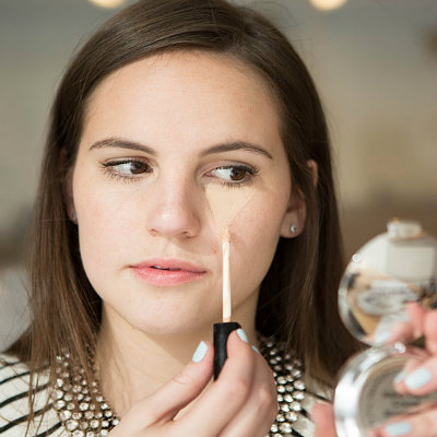 Нанесувањето коректор само на оние делови од лицето каде што е потребно може да изгледа најбрзо и најлесно, но има уште подобар начин. Користете коректор за да нацртате триаголник така што најдолгата страна да биде под окото. Спуштете го горниот дел од триаголникот до почетокот на носот. Бришење на коректорот во кожата со прстите или сунѓер. На овој начин ќе го намалите црвенилото под и до очите и визуелно ќе го издолжите лицето.