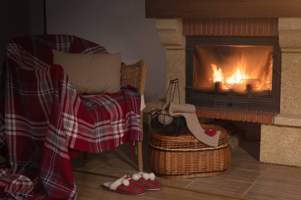 Burning fireplace and rattan armchair with red wool plaid, cozy sleepers with pompons and basket with knitting stuff, quiet hobby holiday concept