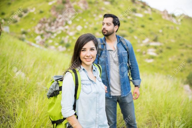 Boyfriend and girlfriend taking a romantic walk in a park and climbing a mountain