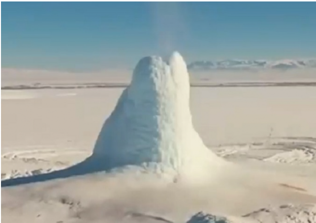 Невообичаена ледена структура што исфрла вода, висока околу 13 метри, се појави во југоисточен Казахстан. Еве како изгледа кога ќе избувне леден вулкан.