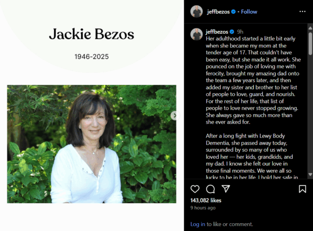 „Таа го посвети својот живот на своето семејство и го вложи своето срце во воспитувањето на своите деца со сочувство, трпение и мудрост. Џеки создаде простор каде што сите се чувствуваа безбедно, слушнато и згрижено. Џеклин Гизе Безос имаше срце за другите и никогаш не го прифати статусот кво“, се вели во соопштението.
