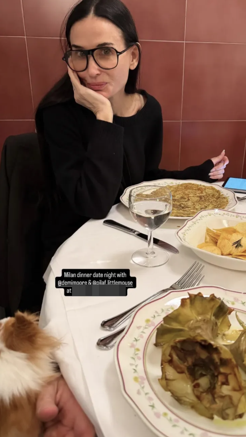 Деми Мур пристигнувањето во Милано за Неделата на модата, го прослави уживајќи во италијанска храна со своето куче.