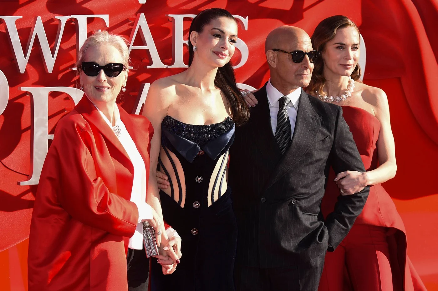 За разлика од Ен, Емили Блант избра огнено црвена боја – нејзиниот фустан по нарачка беше дизајниран од модната куќа “Баленсијага”.