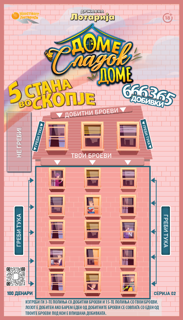 Инстант лозот „Доме сладок доме“ нуди можност за голем број добивки – меѓу кои 5 стана во Скопје, 20 добивки од 100.000 денари, 40 добивки од 50.000 денари и други многубројни парични добивки. Оваа богата понуда ја прави играта особено атрактивна и достапна за сите што сакаат да ја предизвикаат својата среќа.