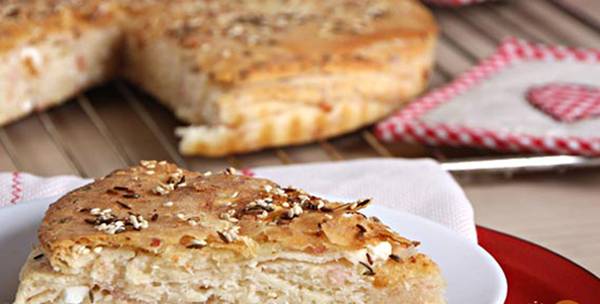 ПОТРЕБНИ СОСТОЈКИ: * 400 г брашно * 1 коцка свеж квасец * 3 супени лажици масло за готвење * 300 г сирење (издробено) * 250 г шунка (ситно сечкана) * 70 мл млеко * 150 мл кисела вода * 80 г маргарин * малку сол, црн пипер НАЧИН НА ПОДГОТОВКА:…